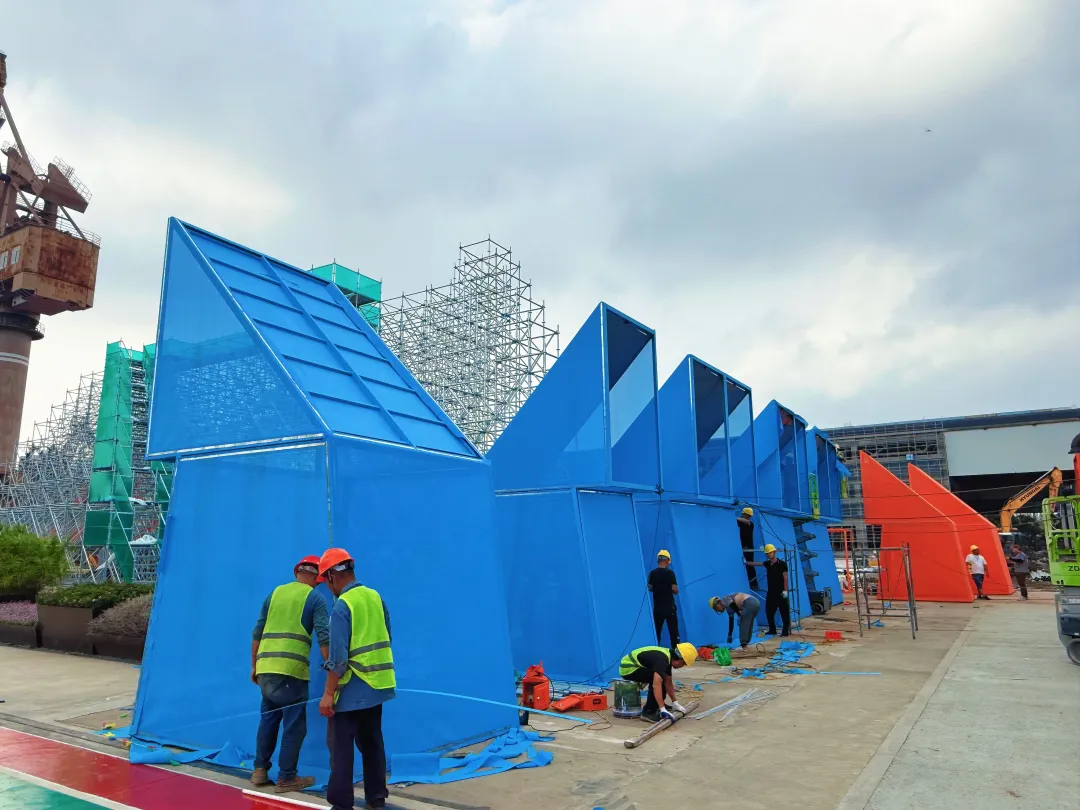 复兴岛上的广场、绿地和亲水空间以及工业厂房都将变身为艺术舞台!多位院士和国内外艺术家带来一系列建筑更新与公共艺术装置在室内展区——A馆复兴云厅、B馆复兴艺廊和C馆复兴实验场还将有兼具沉浸感与互动性的嘉年华式体验正在布展中的A馆复兴云厅