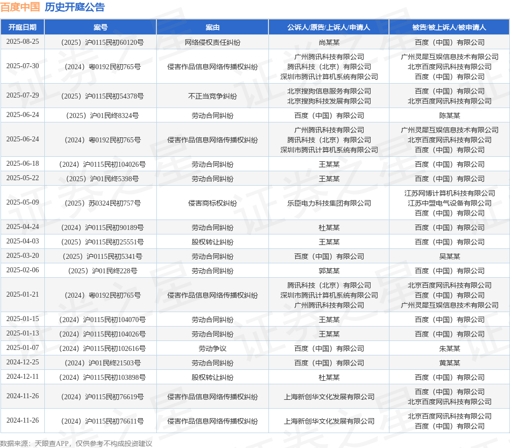 案号:(2025)沪01民终8324号审理法院:上海市第一中级人民法院案由:劳动合同纠纷当事人信息: 原告/上诉人:百度(中国)有限公司 被告/被上诉人:陈某某开庭日期:2025年6月24日根据统计,近一年内以百度(中国)有限公司为当事人的历史开庭公告有283则,其中案由为“侵害作品信息网络传播权纠纷”的公告以255则居首,其次为“劳动合同纠纷”有17则,“网络不正当竞争纠纷”有3则。历史开庭公告(前20条)如下: