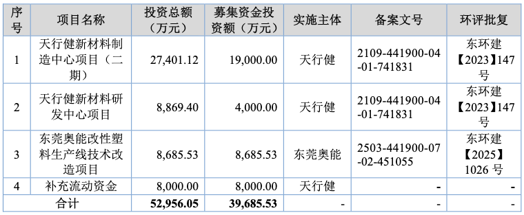 本次IPO,天健新材拟发行不超过1427.86万股,拟募资3.97亿元,包括投向天行健新材料制造中心项目(二期)、天行健新材料研发中心项目,东莞奥能改性塑料生产线技术改造项目,以及补充流动资金。