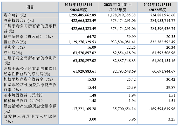 从财务数据来看,2022年~2024年(下称报告期),天健新材的营业收入呈现增长态势,分别为8.32亿元、9.34亿元、11.29亿元,同比变动 12.25%、20.88%,显示出公司业务规模在逐步扩张。归母净利润方面,2022年为6180.42万元,2023年增长至8288.75万元,然而2024年净利润下降至6352.09万元,同比下滑23.36% 。