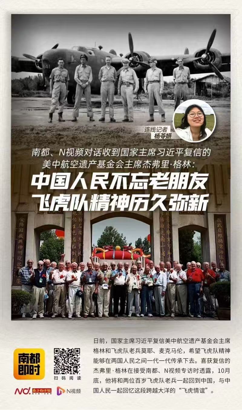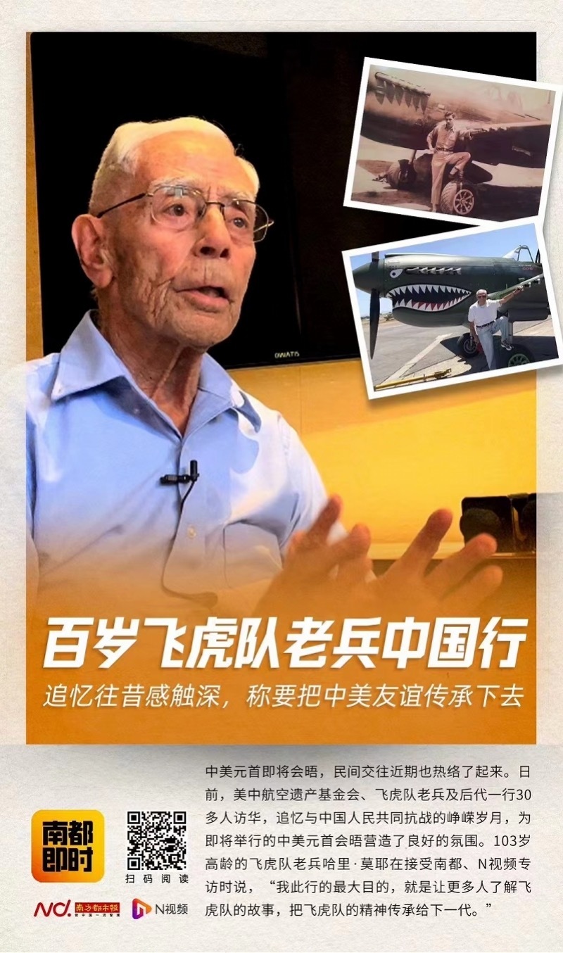 2023年至2024年间,南都记者曾多次跟随美中航空遗产基金会、美国飞虎队老兵及后代等组成的代表团前往柳州、长沙等地,共同追忆中美两国共同的抗战岁月。百岁飞虎队老兵哈里·莫耶曾向南都记者表示,飞虎队精神给美中两国带来启示,是美中人民之间友谊的纽带,这种联系应当不断得到维护。美中两国在应对当今世界许多重大挑战时,依然需要相互合作,携手前进。