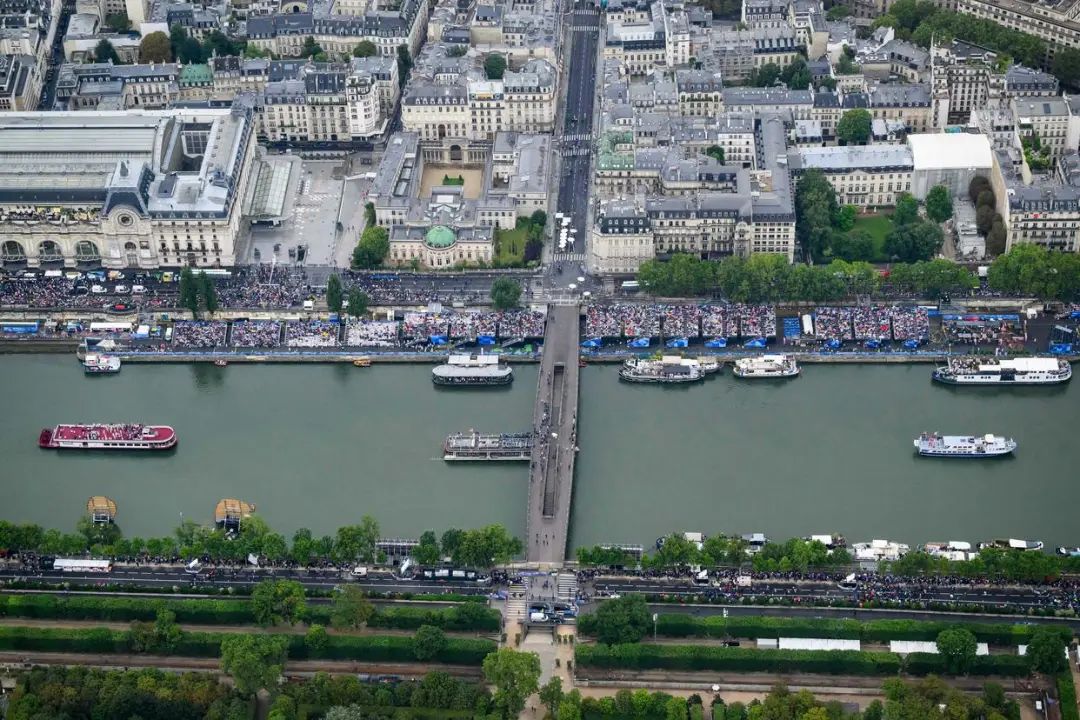 2024年7月26日,第33届夏季奥林匹克运动会开幕式在法国巴黎举行。这是从直升机视角拍摄的塞纳河。新华社发(POOL照片/利昂内尔·博纳旺蒂尔)指定泳区向公众开放