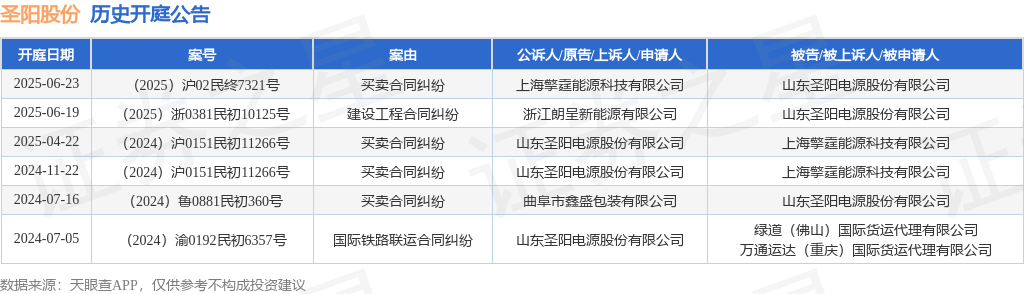 案号:(2025)沪02民终7321号审理法院:上海市第二中级人民法院案由:买卖合同纠纷当事人信息: 原告/上诉人:上海擎霆能源科技有限公司 被告/被上诉人:山东圣阳电源股份有限公司开庭日期:2025年6月23日根据统计,近一年内以山东圣阳电源股份有限公司为当事人的历史开庭公告有6则,其中案由为“买卖合同纠纷”的公告以4则居首,其次为“国际铁路联运合同纠纷”有1则,“建设工程合同纠纷”有1则。历史开庭公告如下: