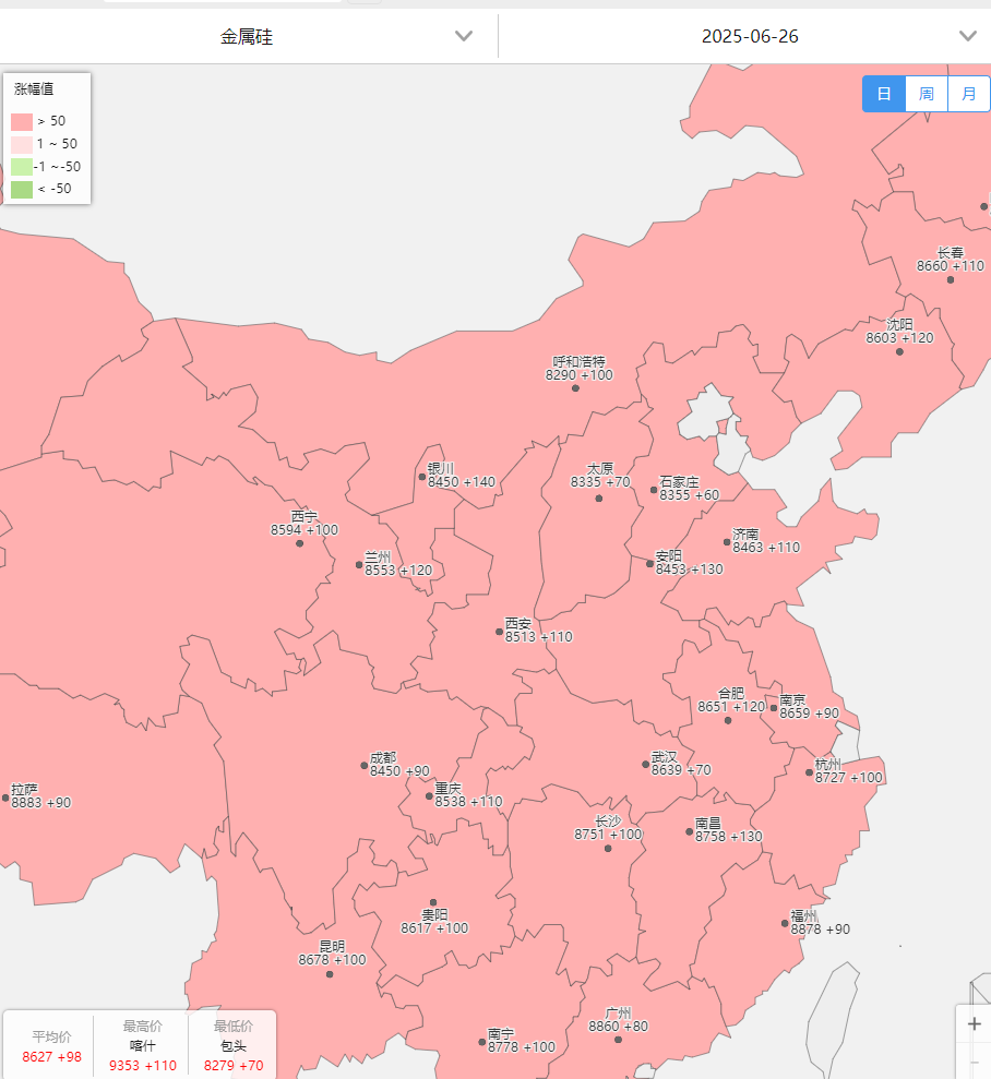 近期工业硅期货表现相较给力,盘面价格逐步攀升(周一工业硅主力合约2509收盘价格为7420,今日收盘价格则为7720),再加之久跌之后浓厚的盼涨情绪及市场询盘情况稍有好转有所改变,近期业内悲观情绪有所修复,整体行情稳挺运行,市场报价随之走高低价货源减少。但当前供需失衡局面明显始终难变(供应端:在整体供应本就宽松的情况下,近期部分地区硅厂复产消息传出再度“雪上加霜”;需求端,整体需求增量有限未有明显改善),整体行情为此依然承压运行,业内部分情绪较为谨慎。据显示:今日421#天津地区市场报价在8400元/吨上下股合网,广州地区市场报价在8400元/吨左右;昆明地区市场报价在8100元/吨附近;553#不通氧昆明地区市场报价在7900元/吨左右。