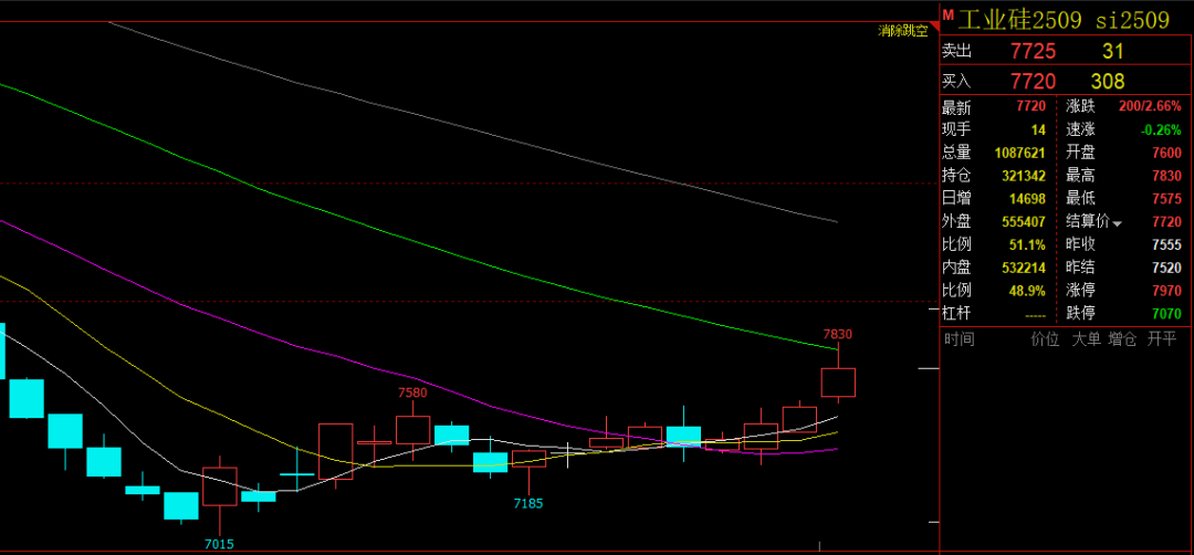 今日工业硅期货行情仍是翻红运行,整体表现相当给力!6月26日,工业硅主力合约2509收盘飘红运行,开盘7600股合网,盘中最高7830,最低7575,上下振幅255,收盘上调200至7720,涨幅2.66%,收盘价格相较上一交易日上调165。另,主力合约当日成交总量为1087621手,持仓量321342手,当前总持仓量570558手。具体情况如下: