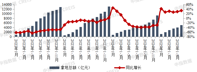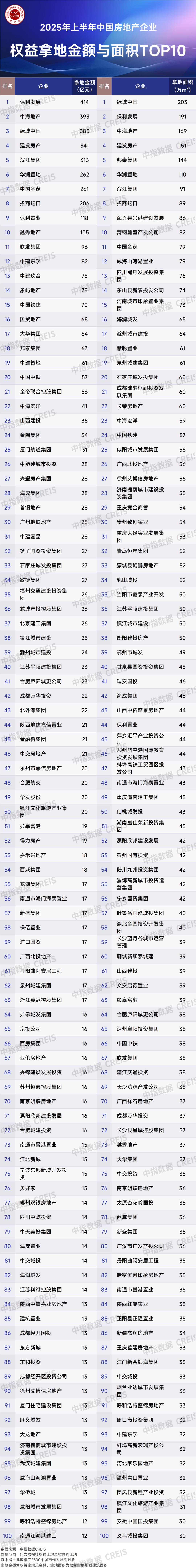 2025年上半年,TOP100企业拿地总额5065.5亿元,同比增长33.3%,增幅较上月扩大4.5个百分点。受上年低基数影响,TOP100企业拿地同比增幅较上月扩大。