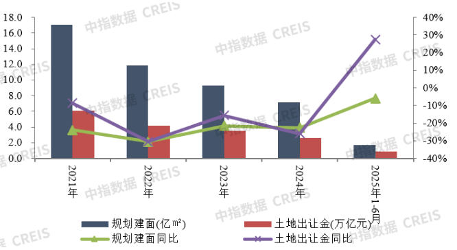 2025年上半年核心城市优质地块竞争激烈,带动300城出让金增长明显,但成交面积仍下降,5月以来溢价率出现回落。根据中指初步统计,2025年上半年(截至6月30日),300城住宅用地出让金同比增幅超两成,平均溢价率超10%,较去年同期提升。房企拿地进一步聚焦,TOP20城市出让金占全国比重超65%。