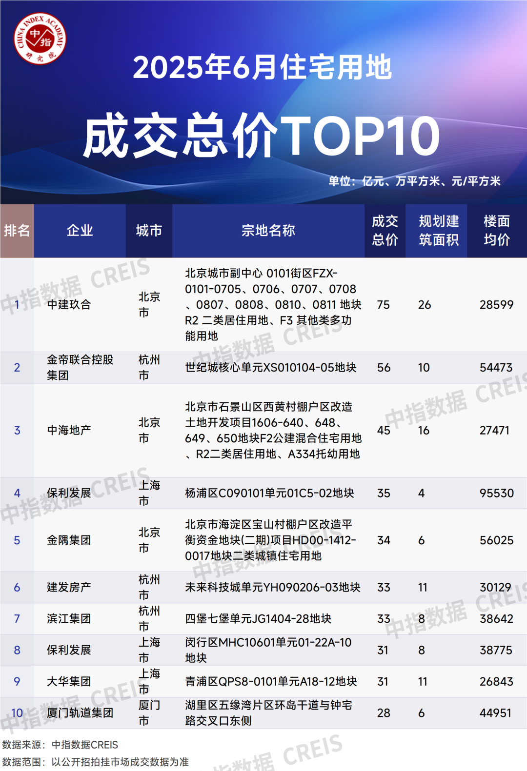 从全国住宅用地成交总价TOP10来看,6月北京、上海、杭州等多个城市均拍出高总价地块。入榜地块中,北京城市副中心0101街区组团地块以总价75亿元位居榜首,该地块由中建玖合摘得。