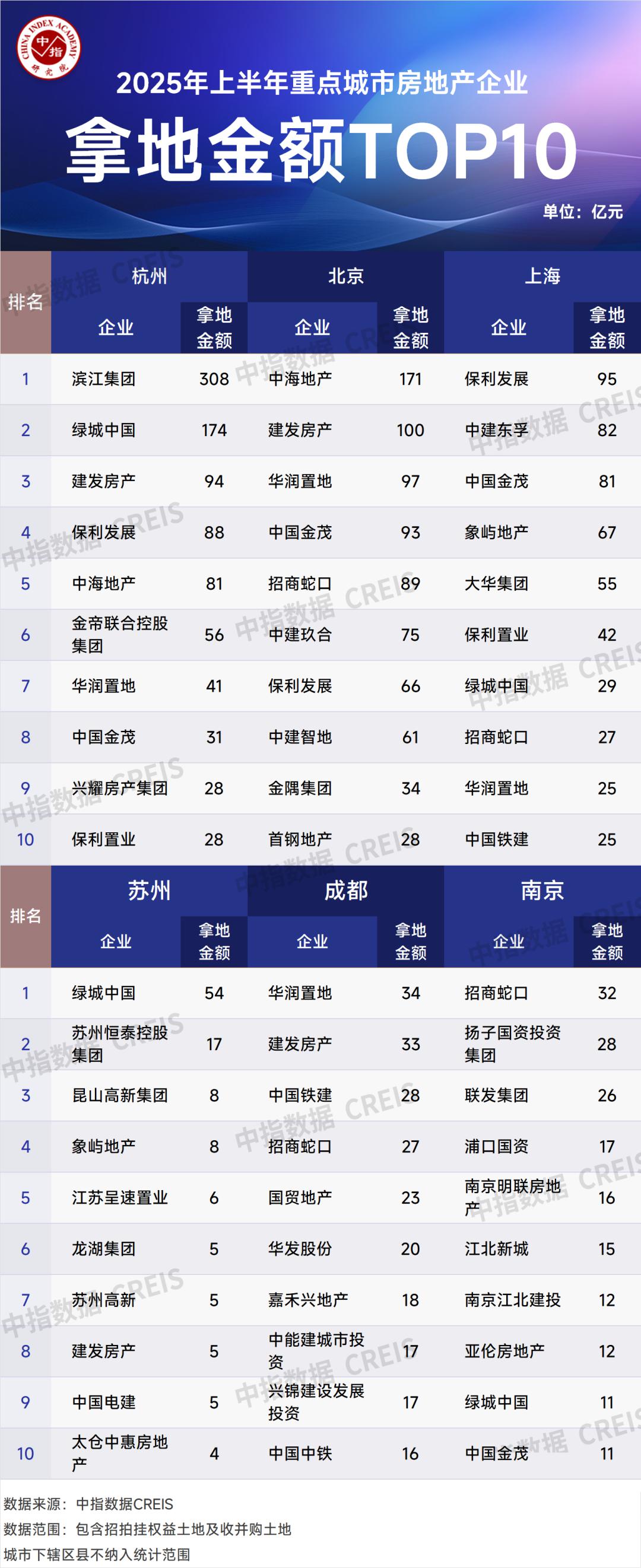 整体来看,2025年上半年,300城住宅用地成交面积仍在缩量,在核心城市优质地块供应增加带动下,300城土地出让金同比明显增长。拿地企业仍以央国企为主,拿地金额前十企业中8家为央国企,部分民企亦有一定投资强度,如滨江集团(002244)拿地金额位居前十,邦泰集团、大华集团等也进入拿地金额前二十。