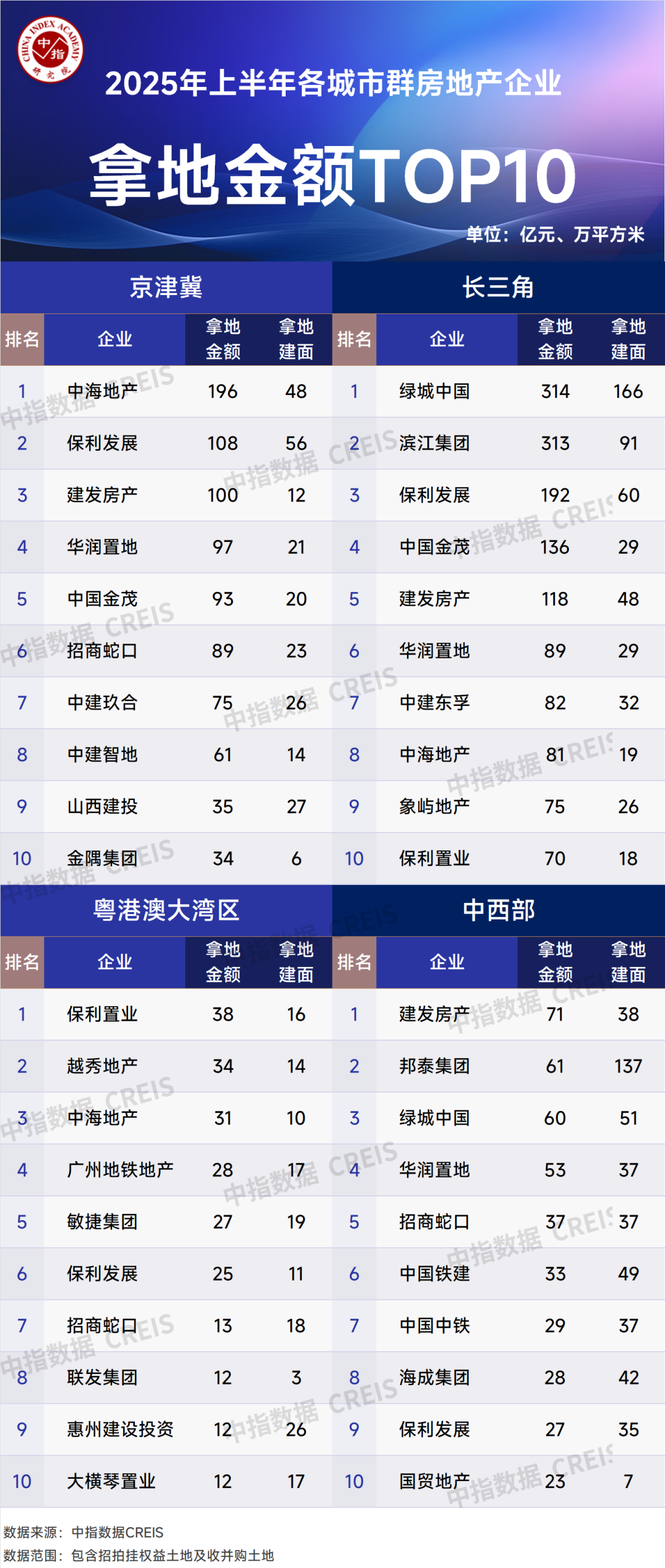 从各城市群拿地金额来看,长三角位居四大城市群之首。2025年上半年,长三角TOP10企业拿地金额1470亿元,位居四大城市群之首,京津冀TOP10企业拿地金额888.0亿元,位列第二;中西部TOP10企业拿地金额422.0亿元,位居第三。