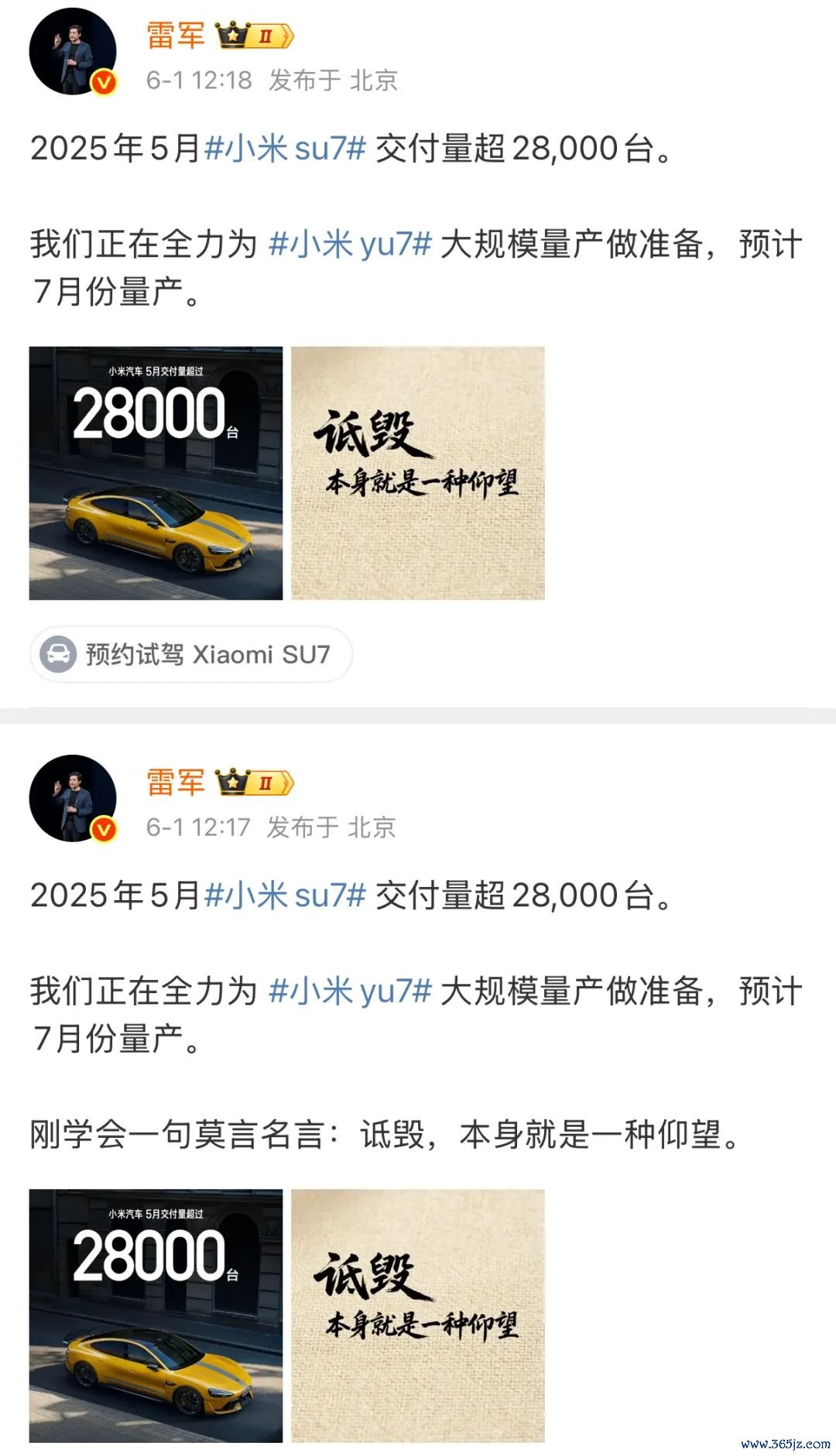雷军称:“2025年5月小米SU7交付量超28000台,正在全力为小米YU7大规模量产做准备冠达配资,预计7月份量产。刚学会一句莫言名言:诋毁,本身就是一种仰望。”